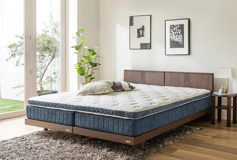 キングサイズはシングルのベースマットレス 2枚の上に、キングサイズのマットレストッパ ー1枚の仕様。大きいサイズでも継ぎ目のない快適な寝心地を楽しめます。さらに将来、シングルマットのマットレストッパーを2枚買い替えれば、2台のベッドに分けて使うこともできます。 (S+M、M+Mも同じ仕様です)